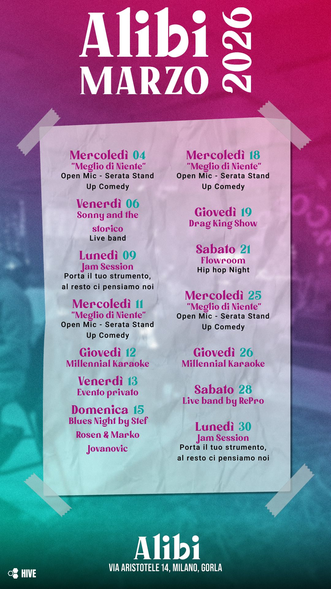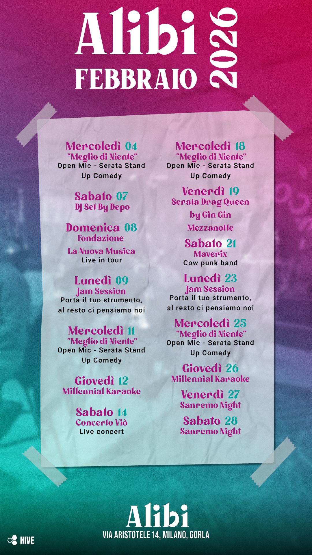 Hai qualcosa da dire, suonare, mostrare? Qualunque sia la tua arte, Alibi è il posto giusto. Sali sul palco, esprimiti, lasciati scoprire.